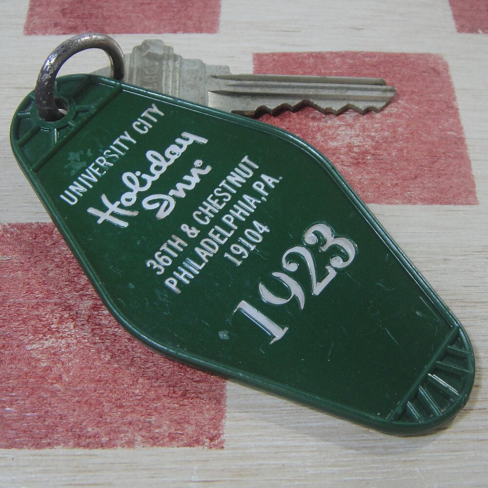 アメリカのペンシルベニア州にある都市フィラデルフィアのユニバーシティシティ地区は市内の繁華で文化的な多様性を持つ広大な大学地域にあったホリデイ・インで使用されていた1923ルームキー付ホルダーです。アメリカンなムードが漂うキーホルダーです。珍しい両面タイプの表示になっています。