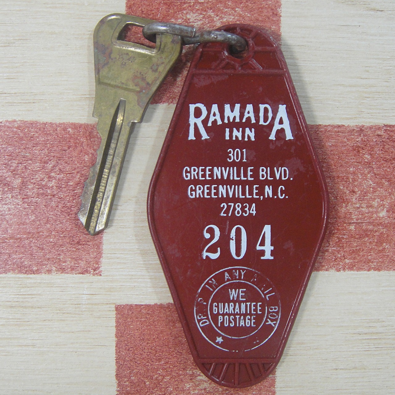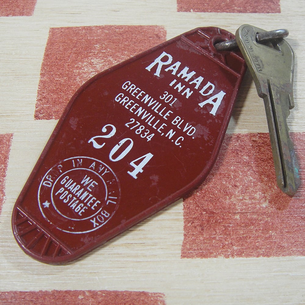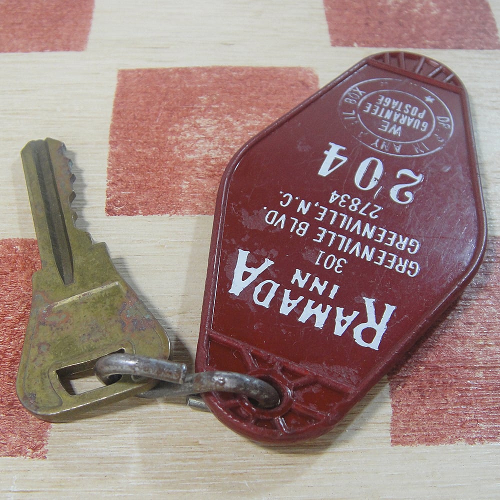70年代頃のアメリカ サウスカロライナ州の都市グリーンビルにあったホテルでラマダ・インの204ルームキー付ホルダー(エンジ色)です。裏面にはロゴマークがプリントされています。アメリカンなムードが漂うキーホルダーです。タグに劣化やエッジに欠けがあるためお買い得品になっています。