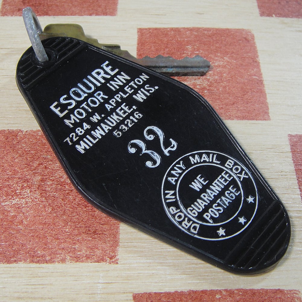 アメリカのウィスコンシン州最大の都市ミルウォーキーにあった70~80年代頃のエスクァイア・モーター・インで使用されていた32ルームキー付ホルダーです。アメリカンなムードが漂うヴィンテージなルームキーホルダーです。現在はエコノミー・インのモーテルになっています。