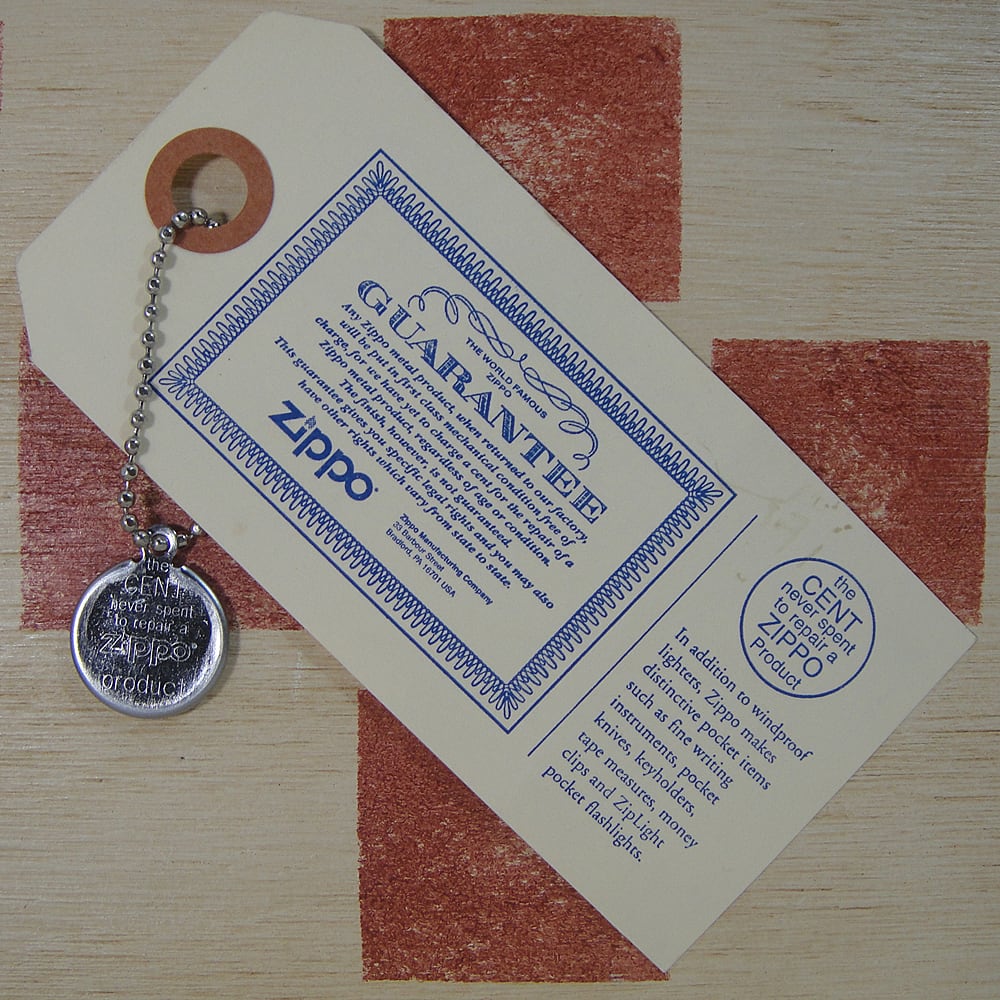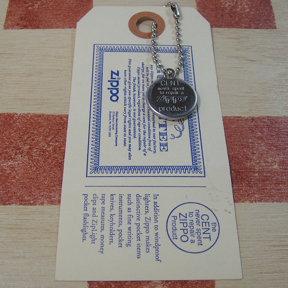 1960年代頃に企画された「幸運のコイン」Zippoラッキーペニーコイン・キーリングの2002年版です。1995年の本物1¢銅貨を使用したZIPPO社は修理に1セントも頂きませんと言うノベルティグッズです。キーホルダーとタグがセットになります。
