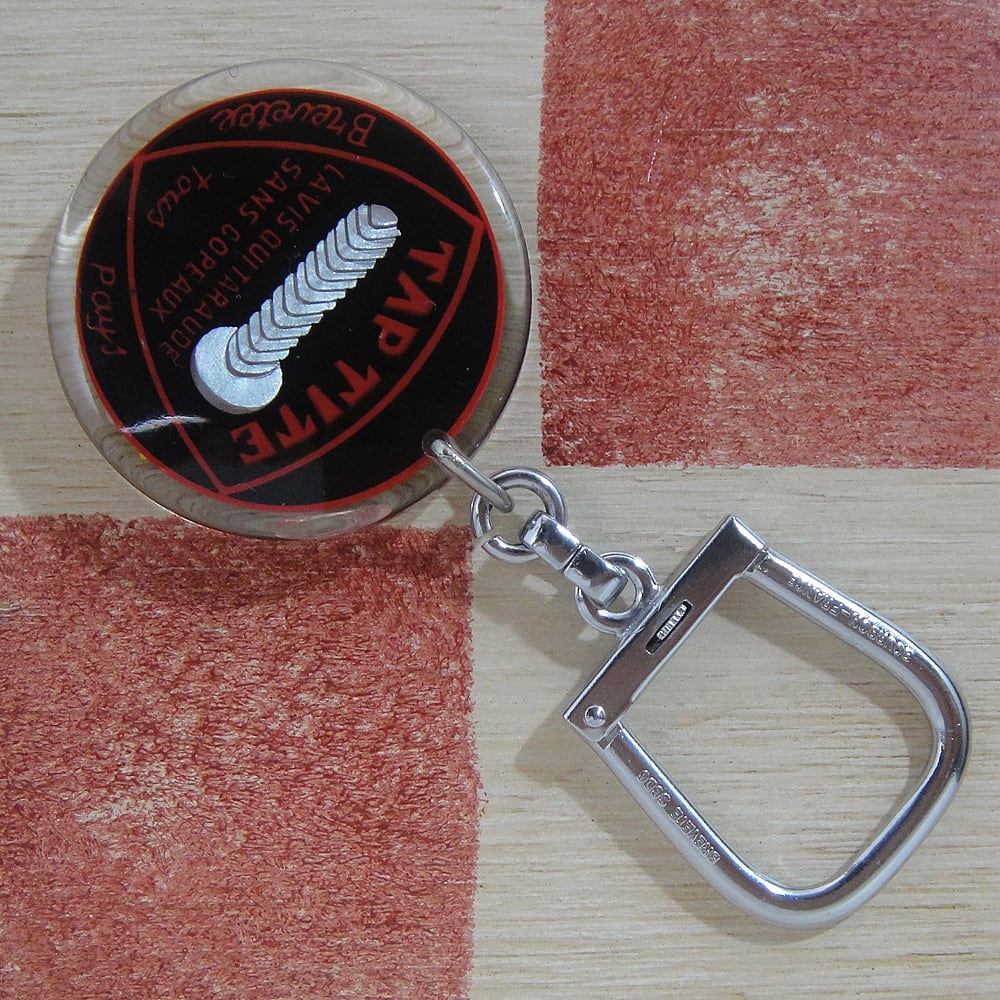 1828年創業のフランスの工具・工業資材メーカーで、ハンマー、ビス、タップなどの工具や工業資材を扱っているゴバン・ドーデ社のブルボンキーホルダーです。クリア樹脂の端に大き目なクラック(ひび)が一箇所あるため、お買い得品になっています