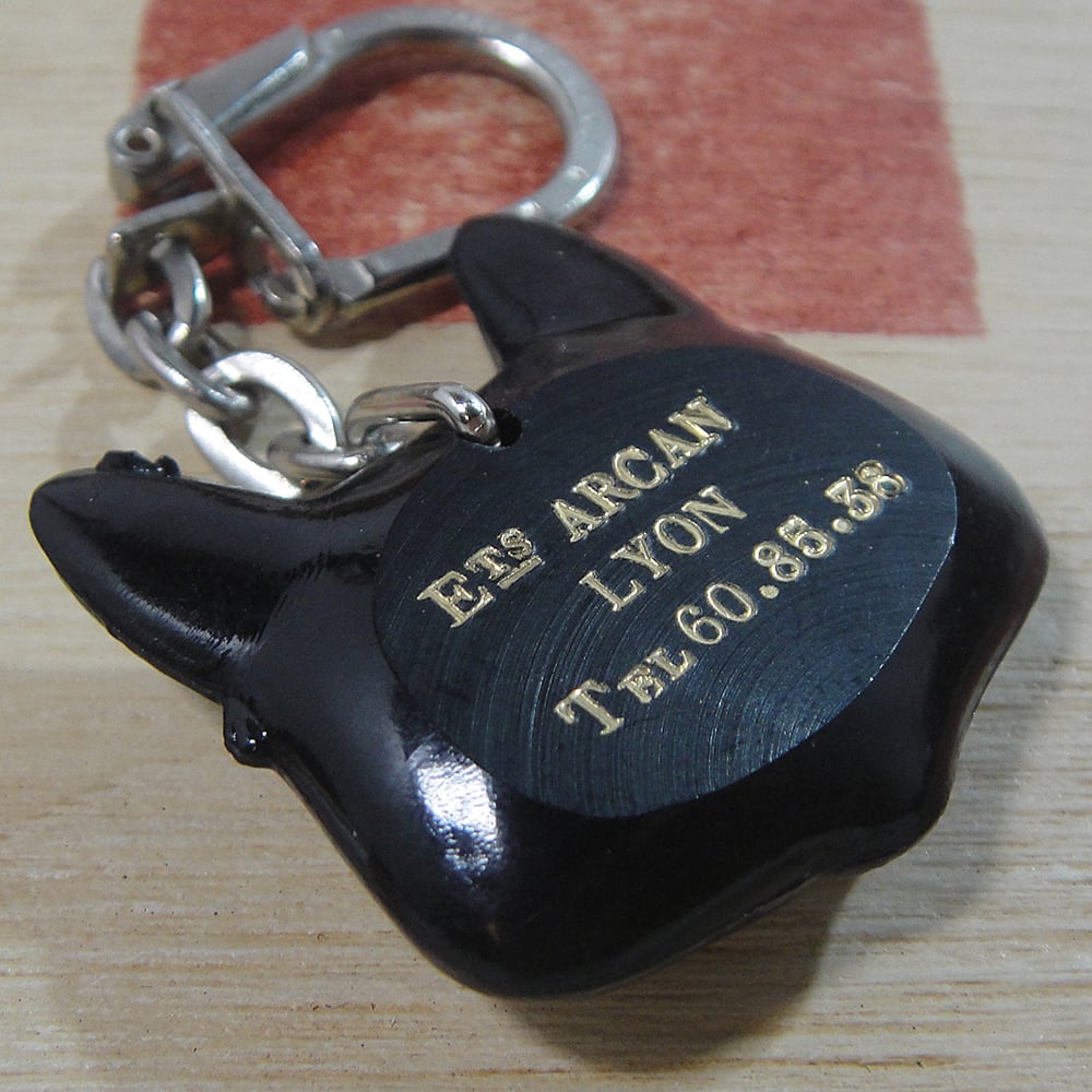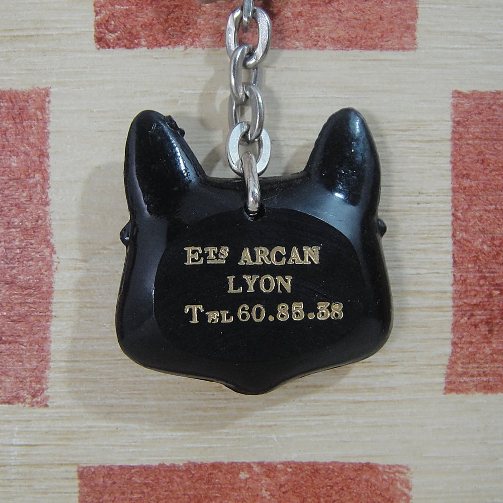 60年代頃のフランス自動車ヘッドライトメーカーのマーシャルで、黒猫キャラクターヴィンテージキーホルダーです。裏面はフランスの都市リオンのカーショップ広告になっています。金具にはMADE IN FRANCEの刻印があります。