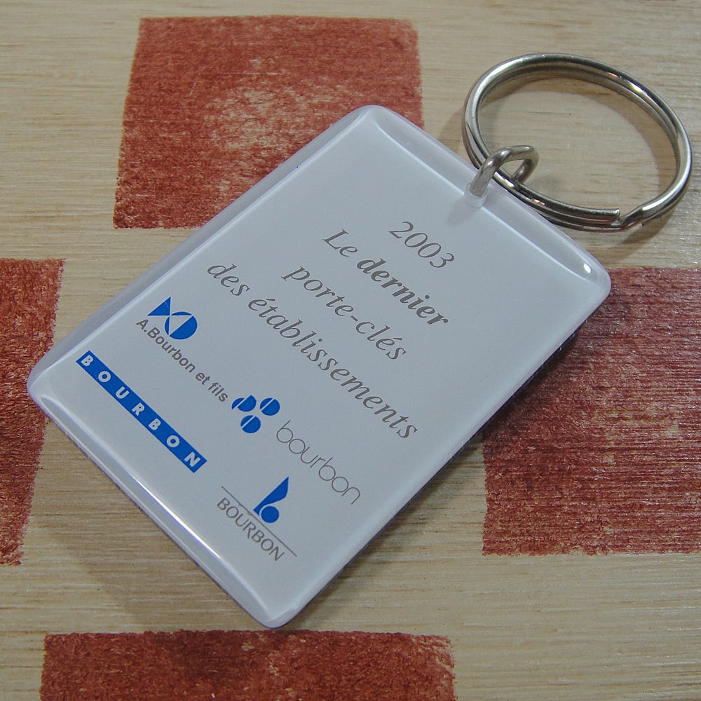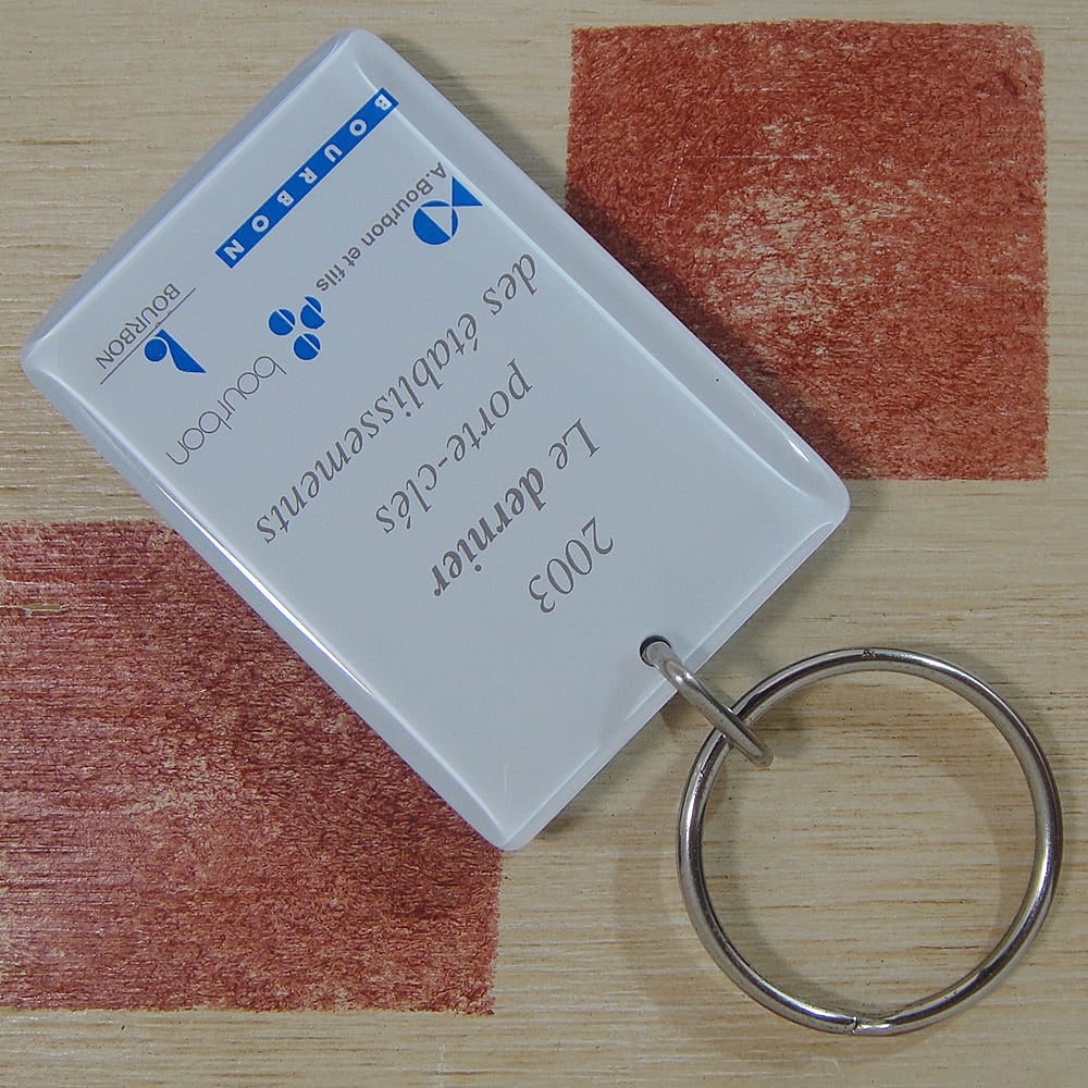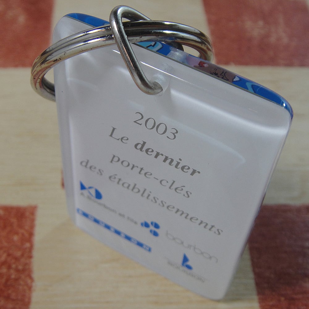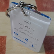 2003年にブルボン社がキーホルダーの製造を終了した年を記念して関係者向けに配布された「ラスト・ブルボン」と呼ばれる非売品の記念キーホルダーです。裏面にはフランス語で「最後のブルボンキーホルダー」といった内容のメッセージが記載されています。