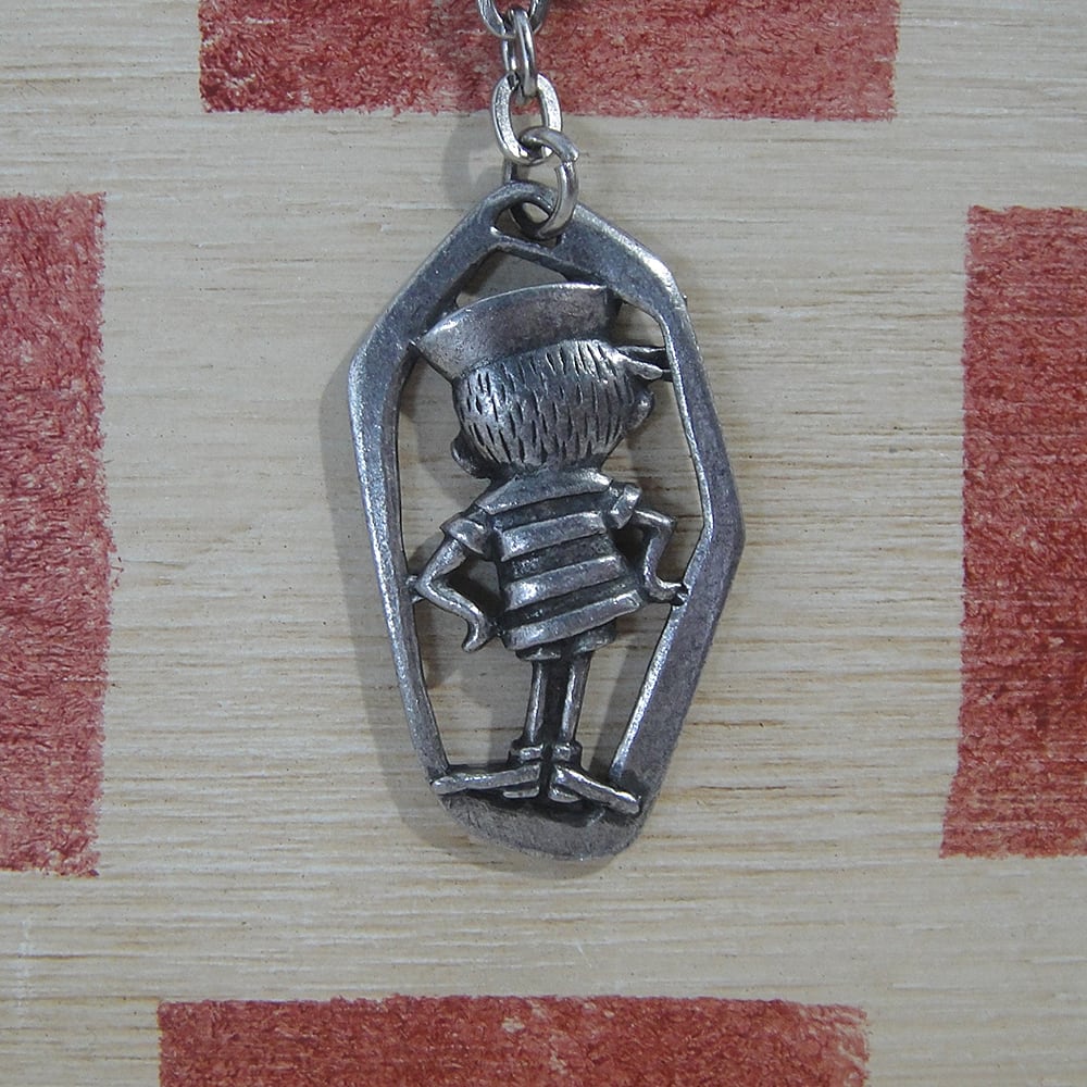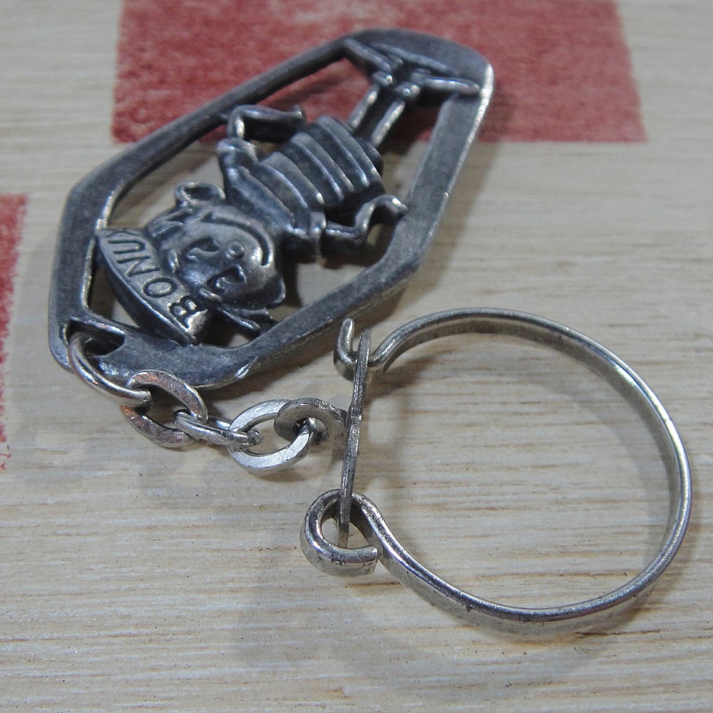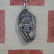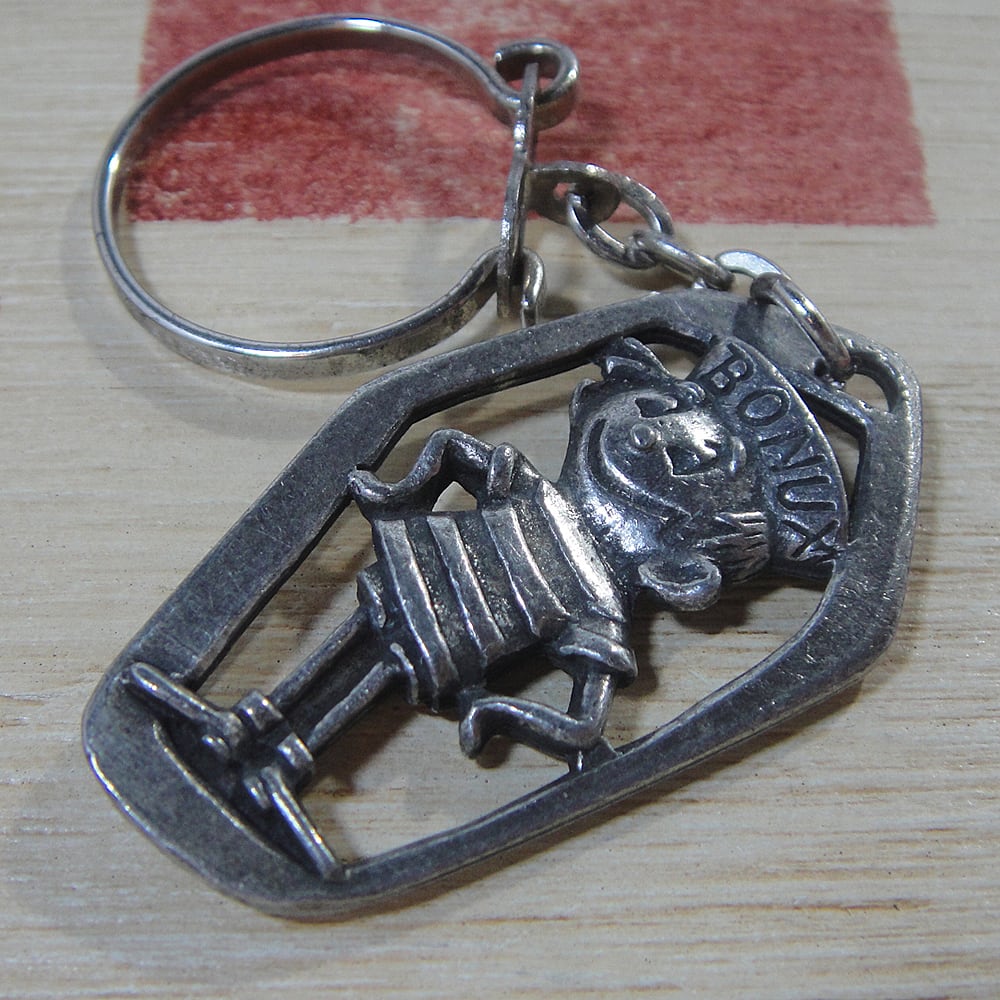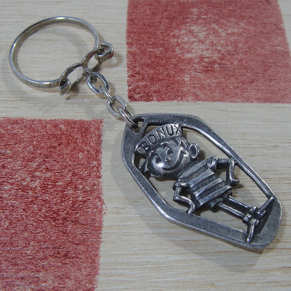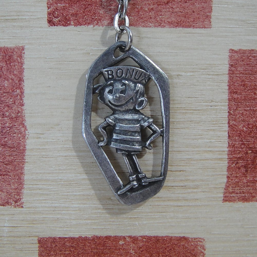 1958 年にアメリカの企業がフランスで設立した洗濯洗剤ブランドボナックス(発売当時はボーナス)はパッケージの中に小さなおもちゃなどのギフトを入れて子供たちから人気を博しました。1960年から1961年にかけて全18号にわたって発行された広告コミックの中で誕生したボナックス ボーイのメタルキーホルダーです。