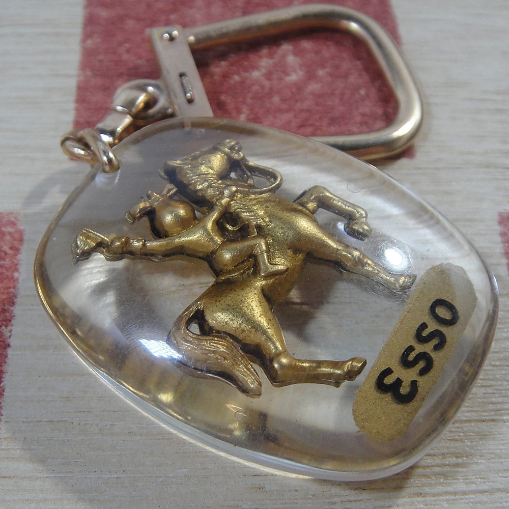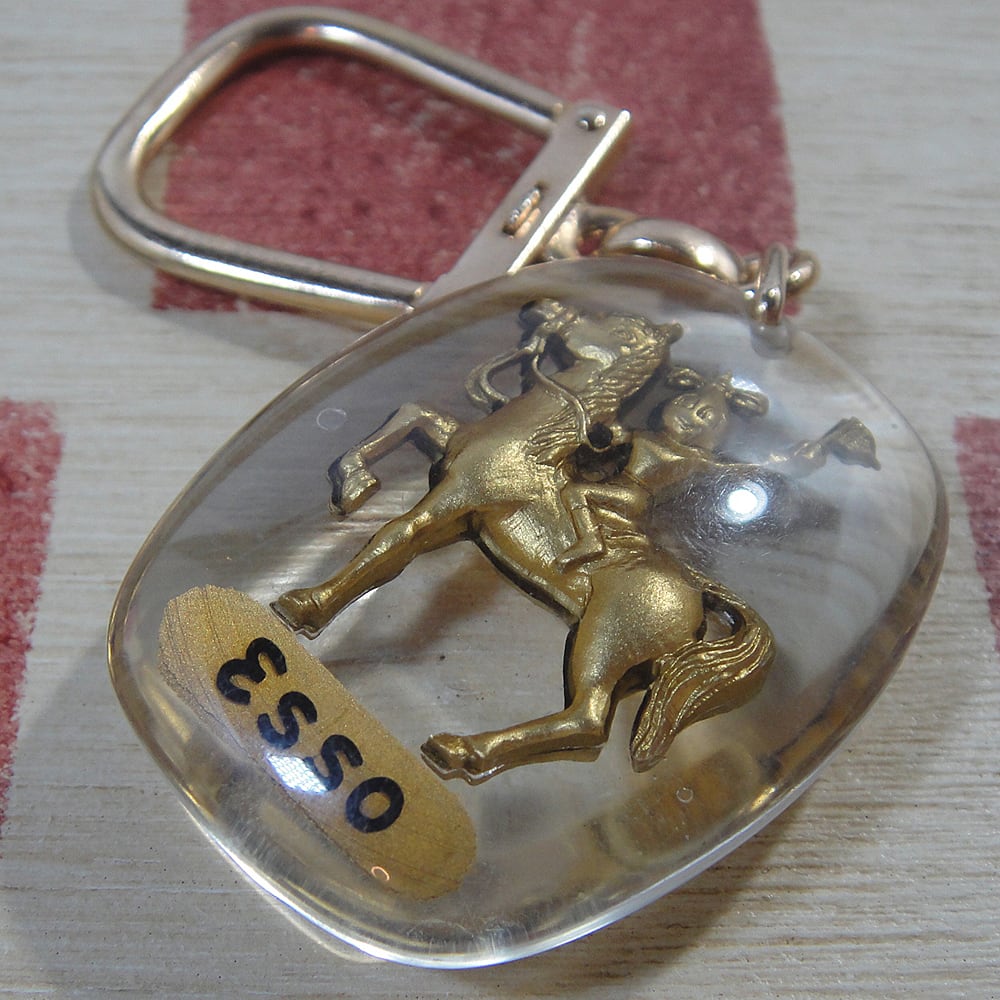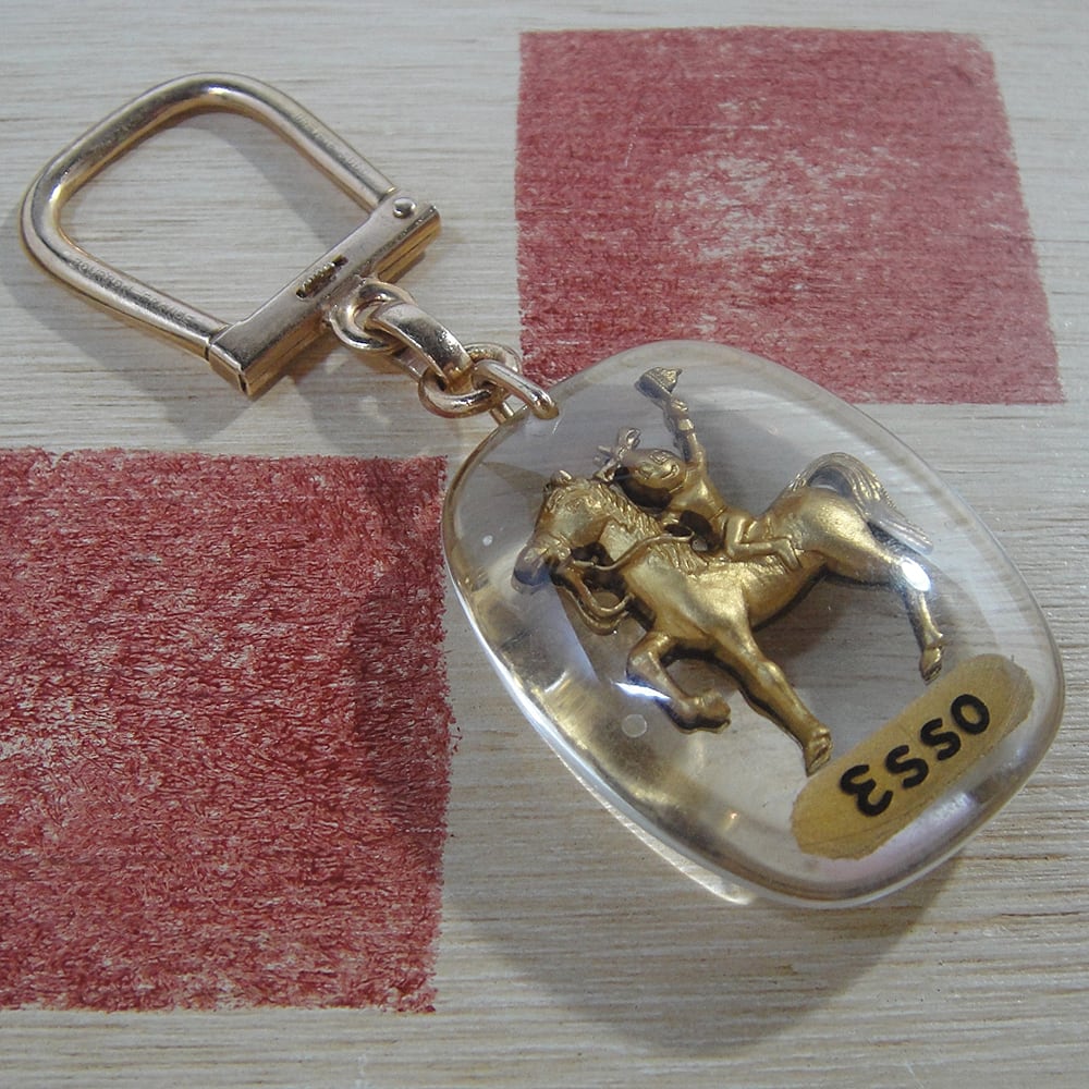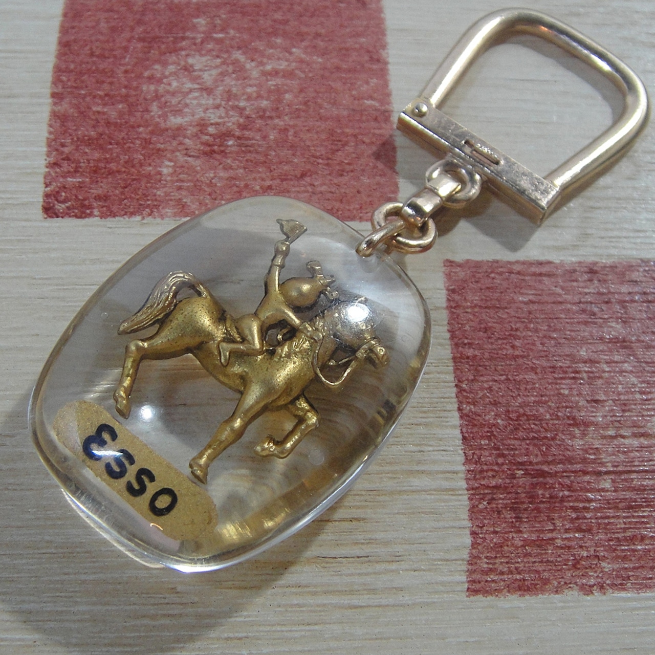 60年代頃のエッソオリジナルキャラクターでゴールド色のオイルドロップガールが馬に乗ったフランス広告ノベルティでブルボン社ヴィンテージキーホルダーです。EssoエッソはアメリカのExxonエクソンモービの関連会社によって使用される商標名です。