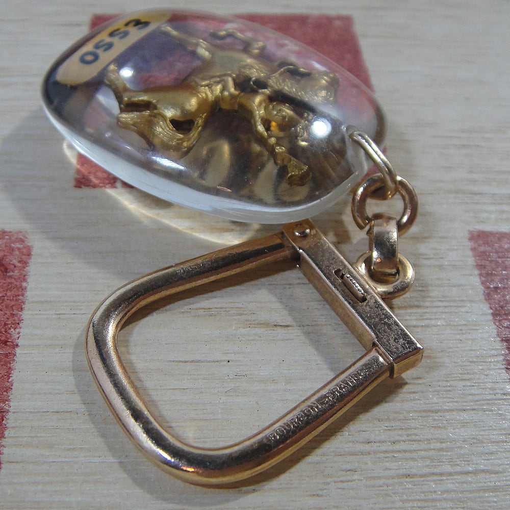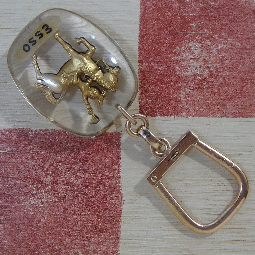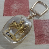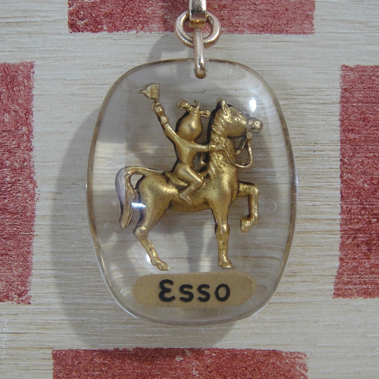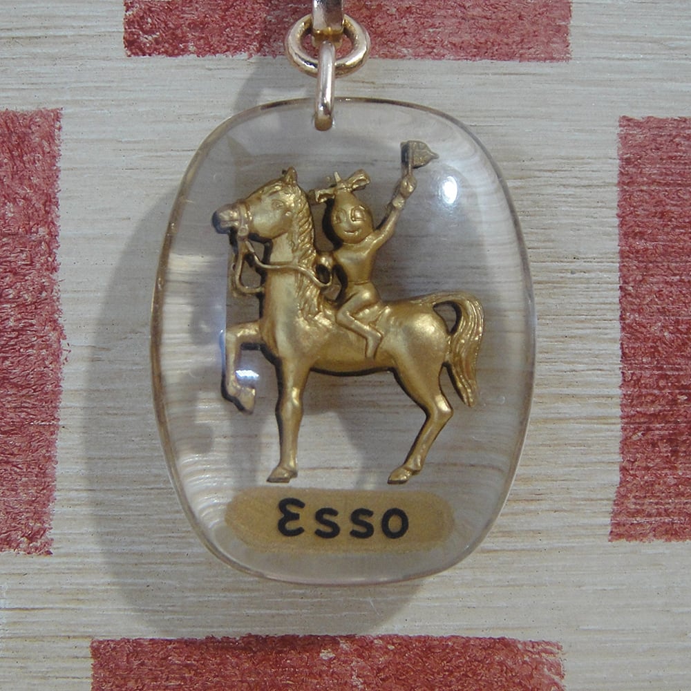 60年代頃のエッソオリジナルキャラクターでゴールド色のオイルドロップガールが馬に乗ったフランス広告ノベルティでブルボン社ヴィンテージキーホルダーです。EssoエッソはアメリカのExxonエクソンモービの関連会社によって使用される商標名です。