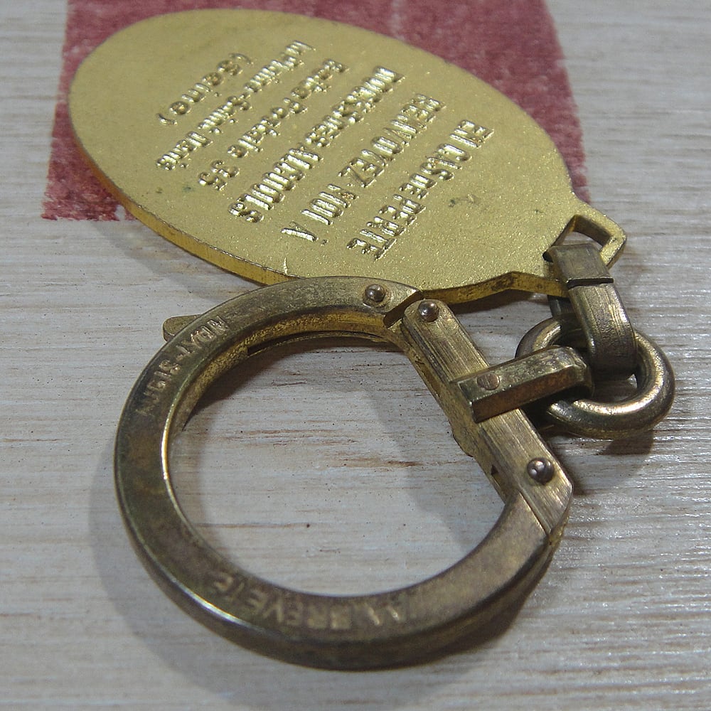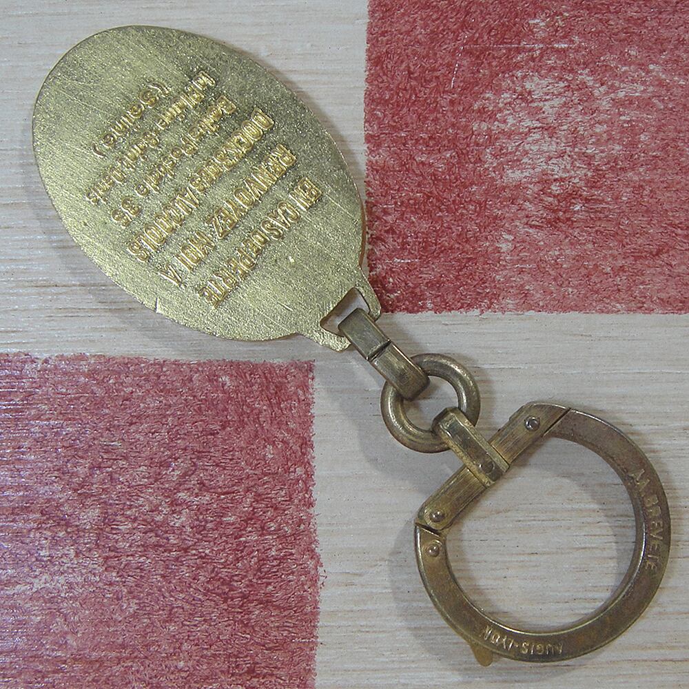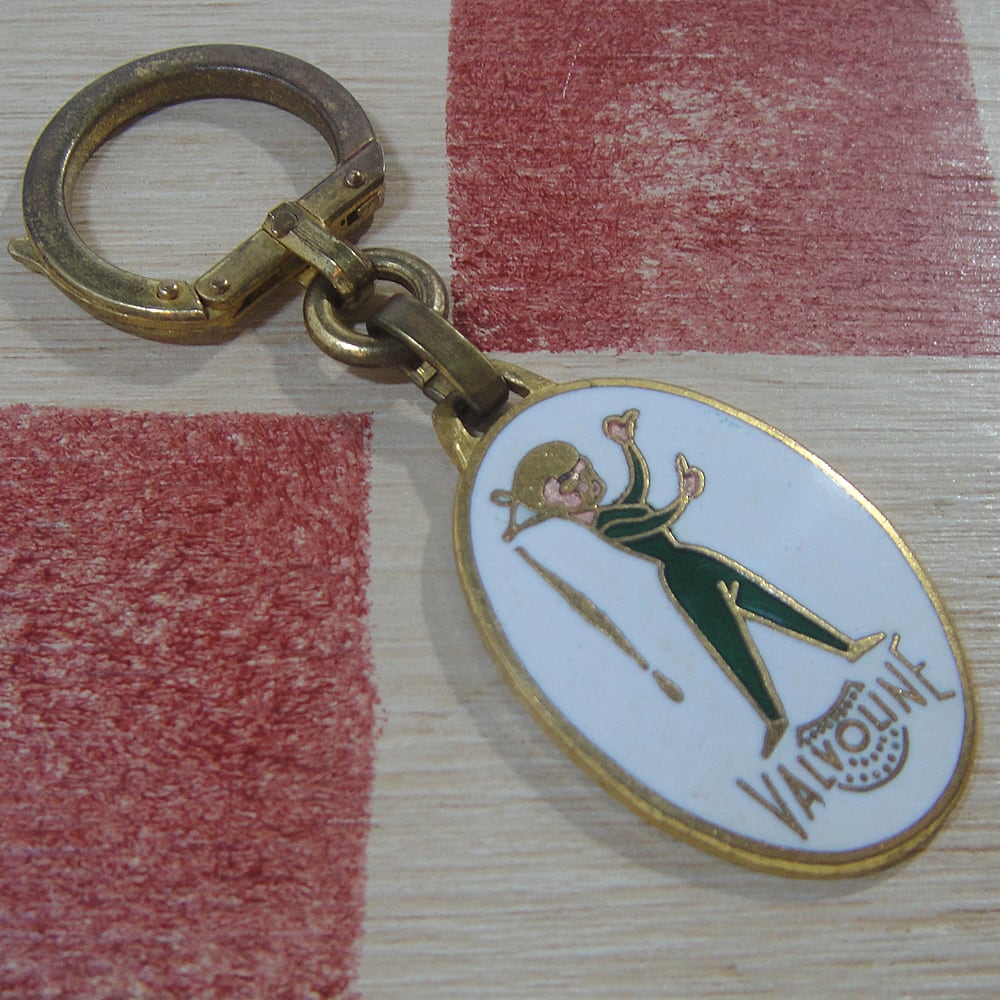60年代頃のアメリカのエンジンオイルブランドVALVOLINE(バルボリン)のヴィンテージなエナメル仕様の金属製フレンチヴィンテージキーホルダーです。裏面はキーホルダーを記載の住所へ返送できるようにするためのタグとして「紛失した場合は、DOCKS DES ALCOOLS(セーヌ県、サン=ドニ平原、私書箱35)まで返送してください」というメッセージになります。キーホルダーはフランスのジュエリーメーカーAugis(オジス)によって製造されたものです。