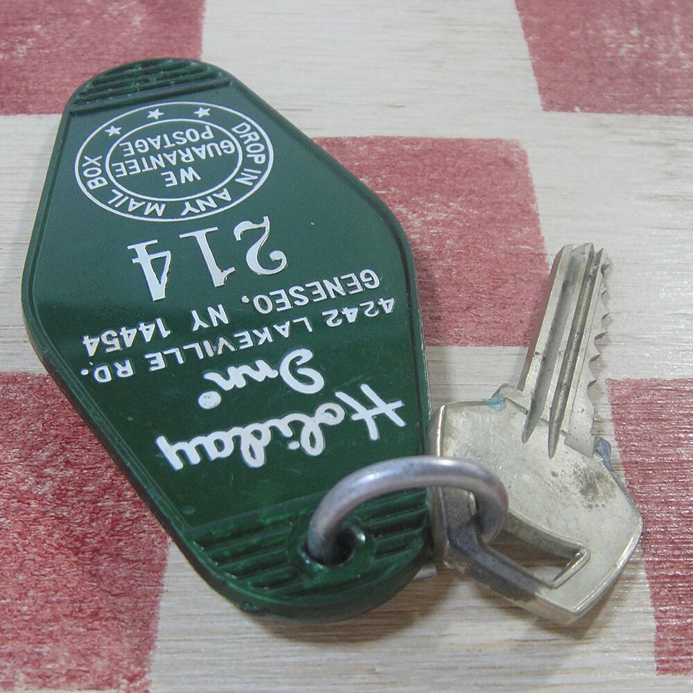 アメリカのニューヨーク州にある町ジェネセオのレイクビル・ロード沿いにあったホリデイ・インで使用されていた214ルームキー付ホルダーです。アメリカンなムードが漂うキーホルダーです。現在はクオリティ・インになっています。
